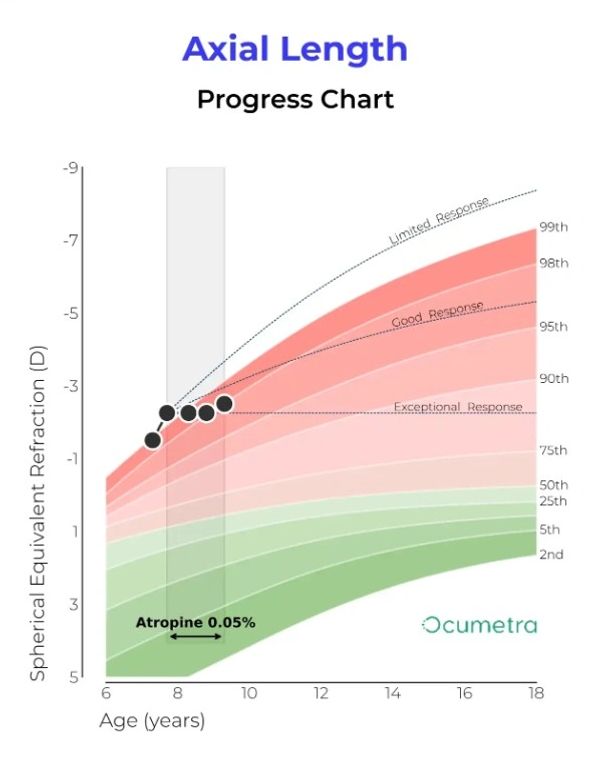 Axial length monitoring is a critical component of modern myopia management, providing an objective and precise way to track how a child’s eye is growing over time. Axial length refers to the physical distance from the front surface of the cornea to the retina at the back of the eye; excessive elongation of this distance is the structural change that defines progressive myopia and is closely associated with increased risk of future eye disease. By measuring axial length at regular intervals, we can accurately evaluate the true rate of progression beyond what glasses prescription alone may reveal, allowing for timely and informed decisions about initiating, adjusting, or combining treatment. This proactive approach ensures that therapy remains tailored to the patient’s individual response, helping slow eye growth, reduce long-term risk, and better protect lifelong visual health. A personalized Ocumetra™ myopia management report is sent regularly.